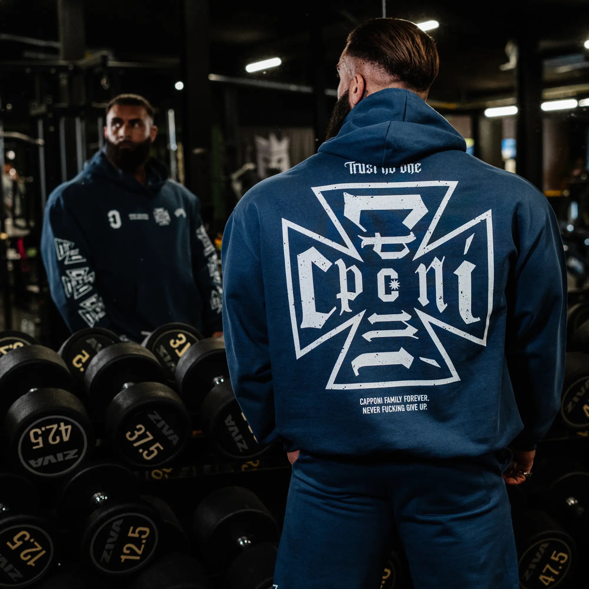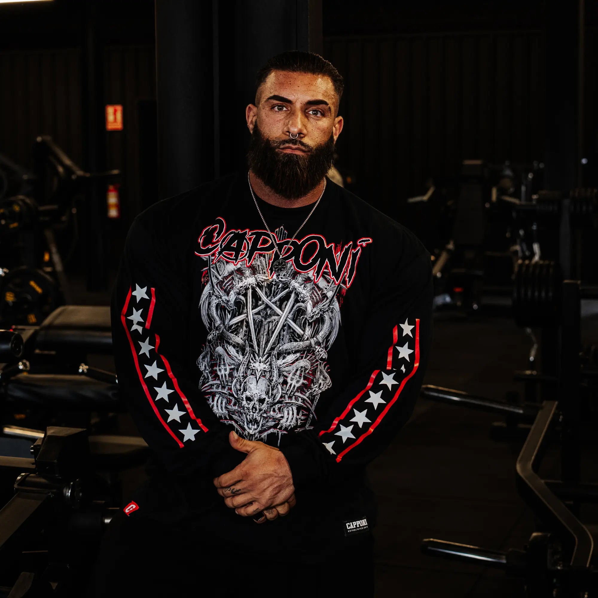 Tejido heavyweight que aguanta el roce de la barra. Corte oversized diseñado para hombros anchos y dorsales desarrollados. Estampación que no se pela después de 50 lavados.